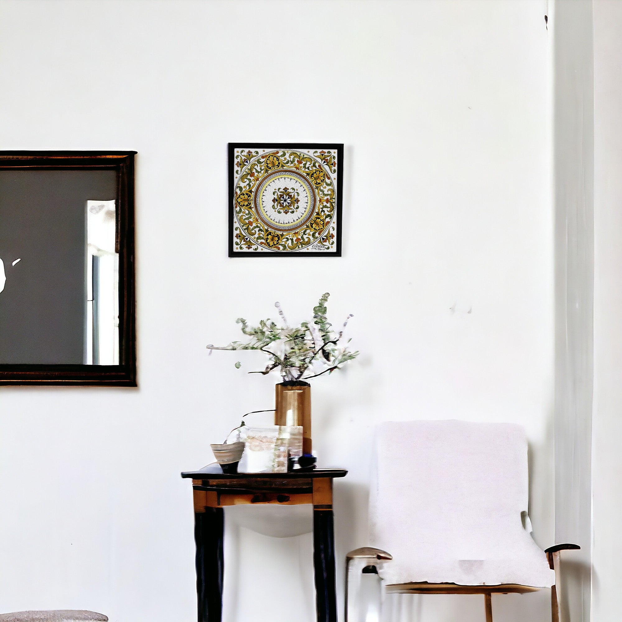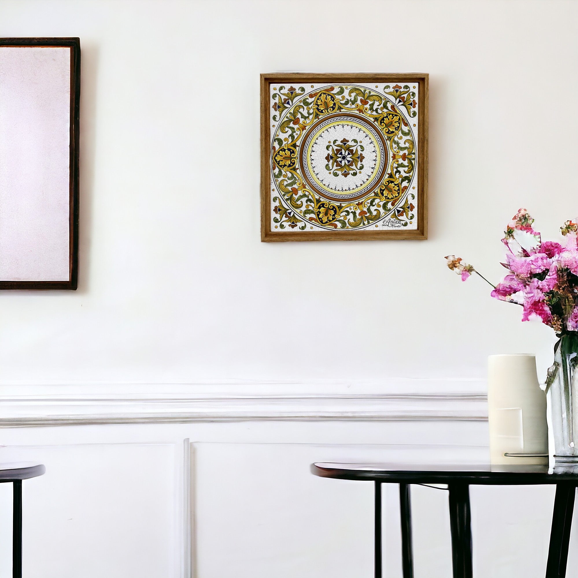 This stunning hand-painted tile measures 12"X12" inches (30x30 cm) and is offered framed or as frameless wall-hung ready.