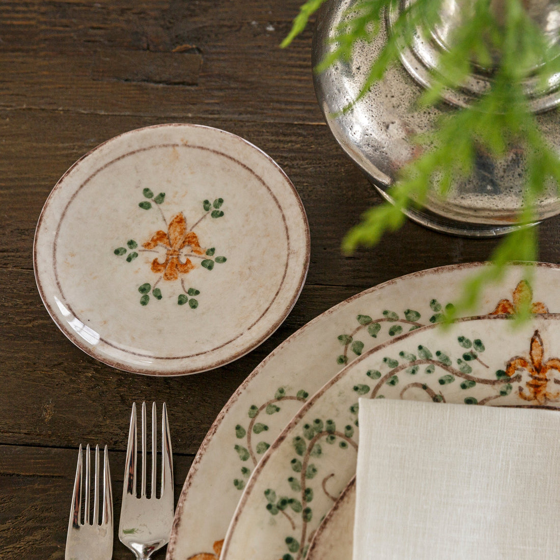 The Medici collection is named for the influential Florentine family known for their many contributions to Italian art and culture. The uneven edges and subtle colors add to the old world feel of this collection. Use as a bread plate or as a canapé plate for serving appetizers. Handmade in Italy. Dishwasher safe on the low-heat setting, non-abrasive detergent is recommended and microwaveable (may get hot).